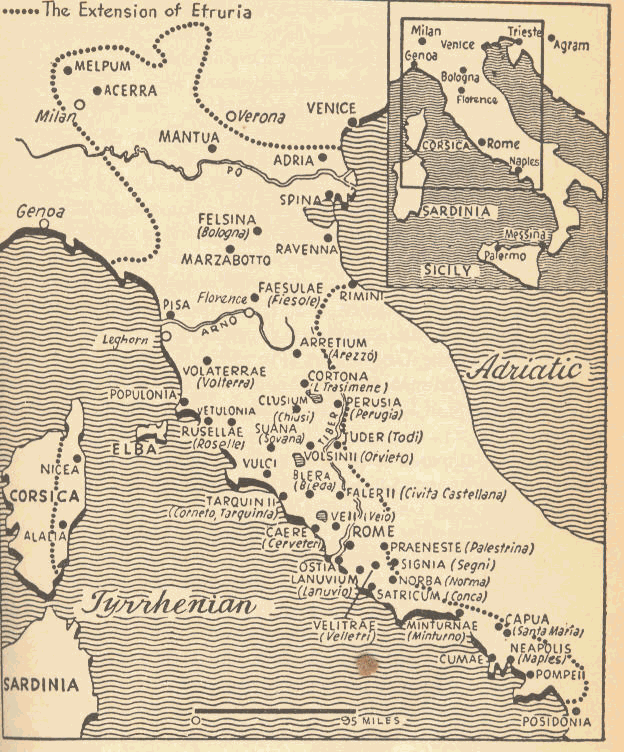 "..az etruszk nép... .. hatalma csúcspontján, az i. e. VI. században még a kialakulóban lévő Róma városát is meghódította, és akkoriban az etruszkok bizonyára úgy érezték, hogy képesek lesznek a többi itáliai nép leigázására is. Amikor ez nem sikerült, önmagukba zárkóztak, megpróbáltak ellenállni Róma egyeduralmának, és később, már római uralom alatt, továbbra is makacsul ragaszkodtak kultúrájukhoz, szokásaikhoz. ..Bár az etruszkokat ma sokan Itália őslakóinak tartják, és néppé válásukat az ún. Villanova-kultúra (az elnevezés a Villanova községben feltárt vaskori emlékek nyomán keletkezett) kereteibe helyezik, elterjedt vélemény, hogy nem tartoztak a régi italikus törzsek közé, hanem az i. e. IX. században érkeztek a félszigetre. ... ma sokan úgy gondolják, hogy tengeren érkeztek a tirrén partokra. Hérodotosz azt állítja, hogy maguk az etruszkok őrzik azt a hagyományt, hogy a kis-ázsiai Lüdiából származnak. Hosszú tengerparti hajóút után érkeztek meg a mai Toscanába, ahol letelepedtek, és ahonnan kiindulva meghódították a szomszédos Umbriát; "ma is ott élnek és ott vannak városaik" - mondja Hérodotosz. Később dél felé is előrenyomultak, kiterjesztették hatalmukat Latium nagyobbik részére, és elfoglalták Közép-Itália egész nyugati, az Arno és a Tiberis közé eső sávját. I. e. 550 körül tovább terjeszkedtek déli irányba, Campania felé, majd északkeleten és keleten, a mai Milánótól Bolognáig (Mediolanum-tól Felsina-ig) létesítettek új településeket."